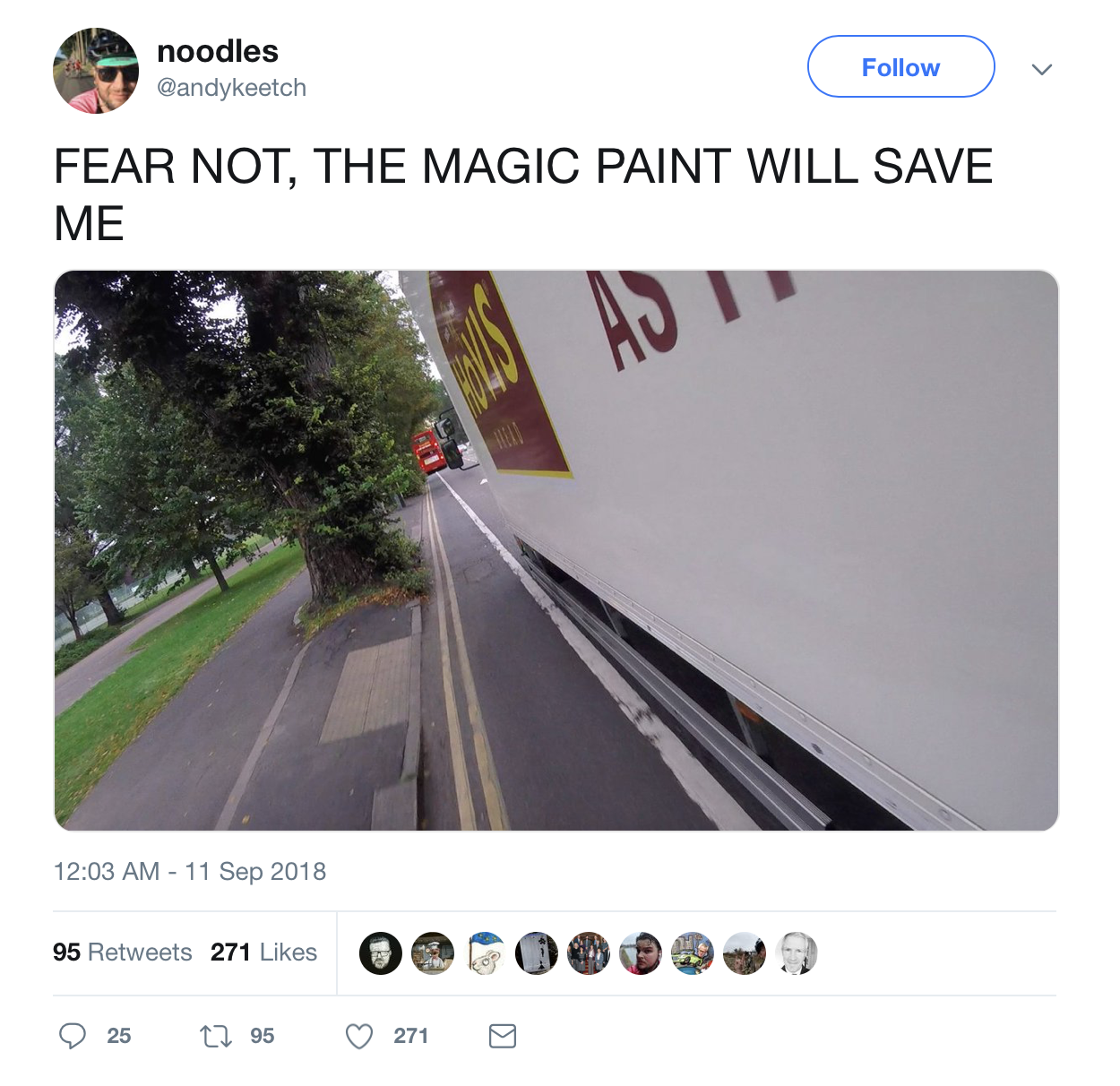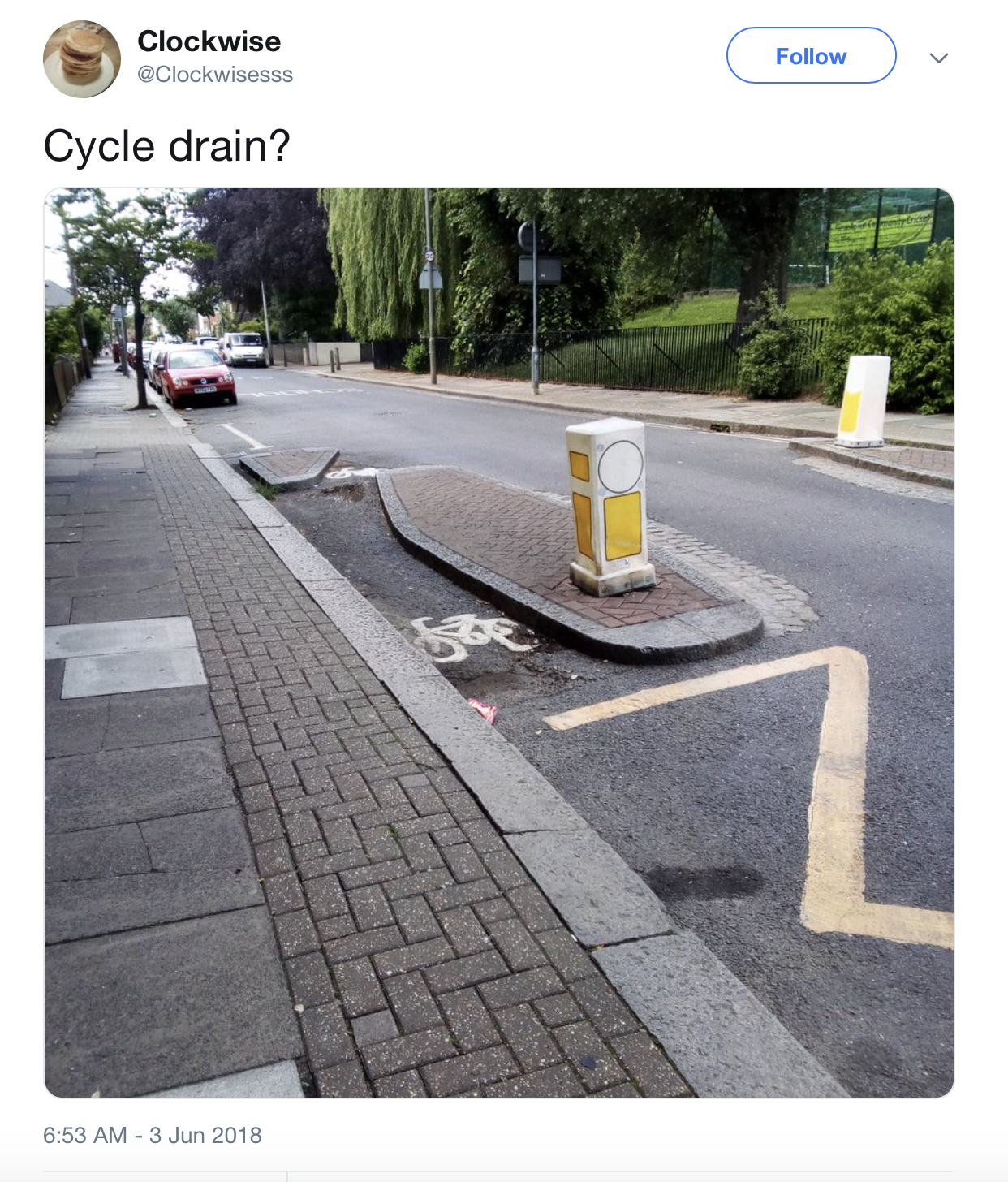 (7) Narrow cycle lanes that essentially keep you in the gutter, cars parked across them, pot holes that can throw you over the handlebars. After a few months of cycling you begin laugh knowingly at tweets like the ones below, and realise just in how many ways the car is still king.
