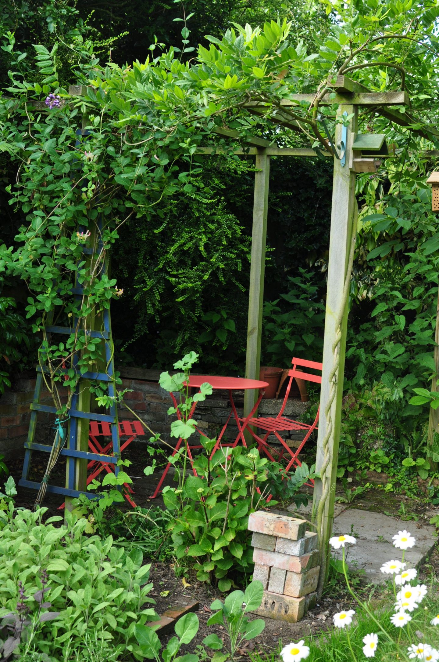 I think my very favourite spot in the garden is the little paved area at the end, under the pergola complete with wisteria and honeysuckle. Sunday breakfasts at our coral bistro set are a little slice of heaven. We’ll be gently encouraging both plants to make more of a canopy over the top- the smell while the wisteria is flowering is already amazing, but I’d love the smell of honeysuckle to take over later in the year. Eventually we’re hoping to get a wee outdoor sofa for this bit too, and a few outdoor fairy lights to take us into the evening.