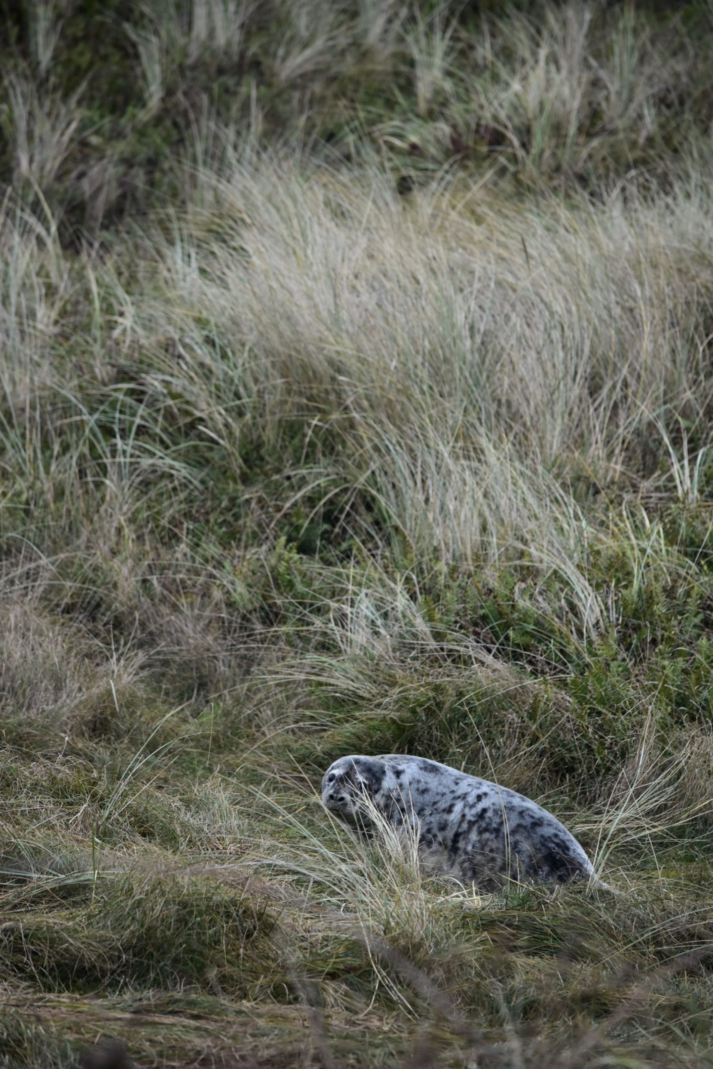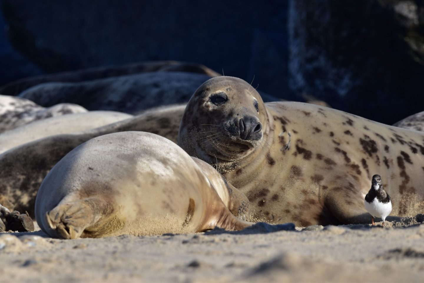As with seabird colonies, you could smell them before you could see them – a sharp iron-y odour that prickled one’s nose as a prelude to spotting the hundreds of grey shapes snoozing by the waves. Turnstones and sanderlings picked their way around the sleeping giants, with the herring and black backed gulls providing a more ominous presence (they were mainly there as a cleaning crew, eating the bodies of the pups that didn’t make it- it’s worth bearing in mind that you will see dead pups at this time of year). A lot of the males were nursing injuries that were probably sustained during their struggles to be beach master – another reminder of the sometimes brutal realities of grey seal life.