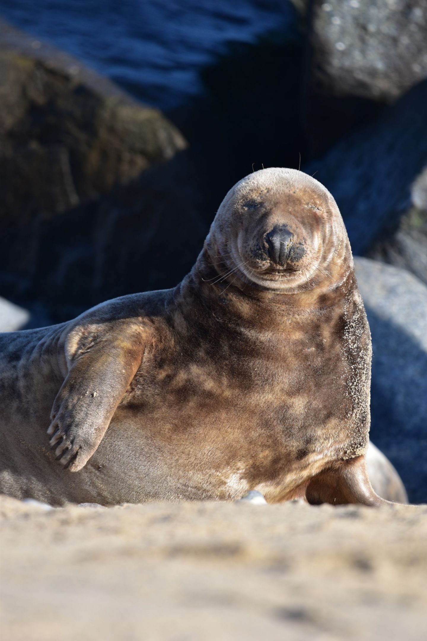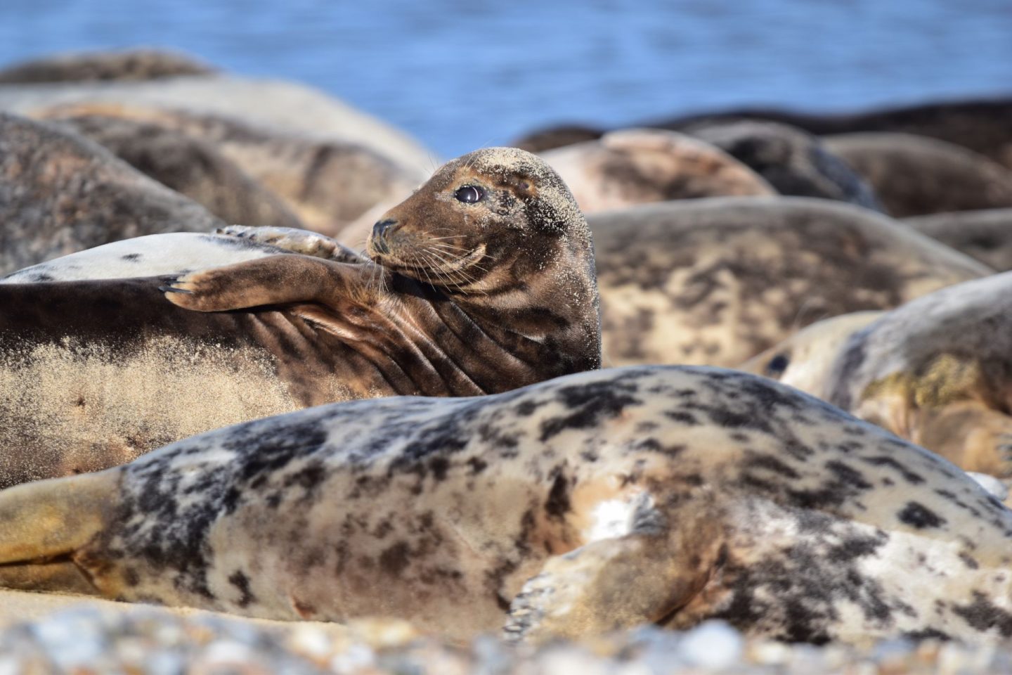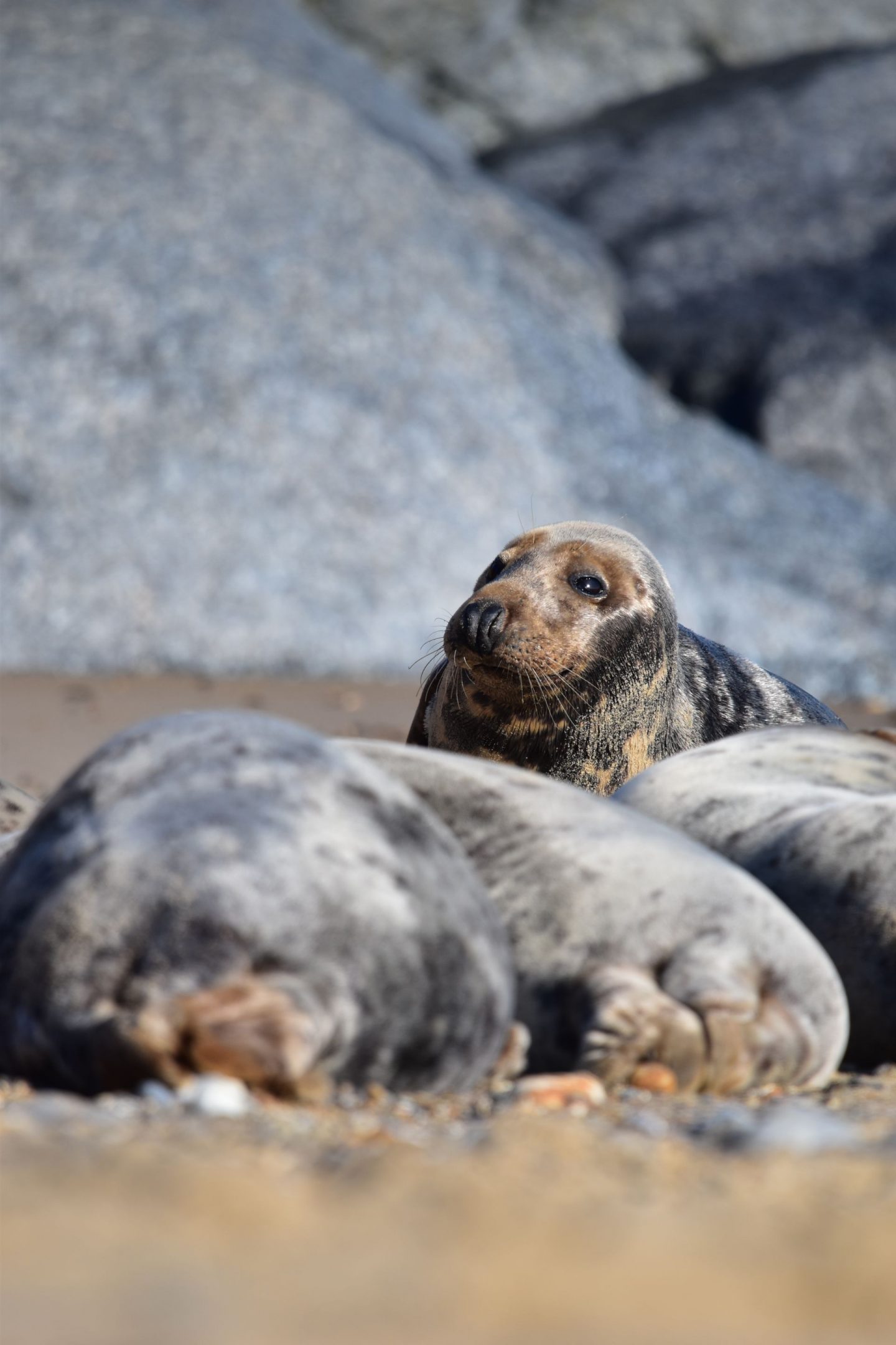 But not everything was grim evidence of the struggle for survival. I took out my new 600mm lens (an act which if regularly repeated is going to give me incredible biceps) and started scanning through the colony. It was wonderful to be able to see the little details that would otherwise go unnoticed, like the seals’ wiry eyebrows or the little notches on the side of the head that show you where the ears are. They were clearly enjoying the warmth of the sun, and things were remarkably calm compared to two months ago when pupping was in full swing. A couple of very late pups still had their air of innocence and mournful eyes, and I was stricken as always with the fact that they’d soon be heading out into the unforgiving North Sea to make their way in the world.